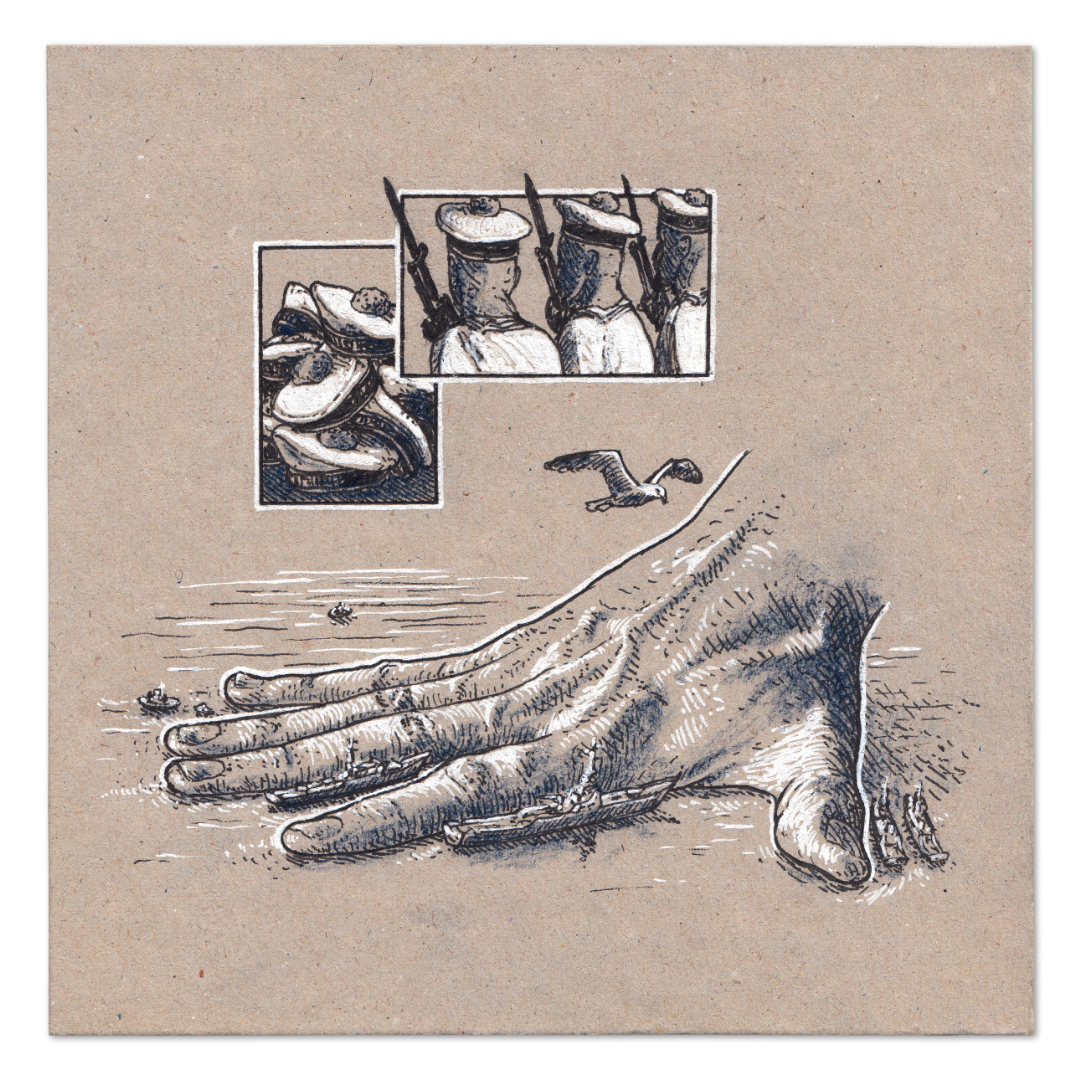 20 x 20 cm – Encre, posca blanc et crayon pastel sur carton – 2025